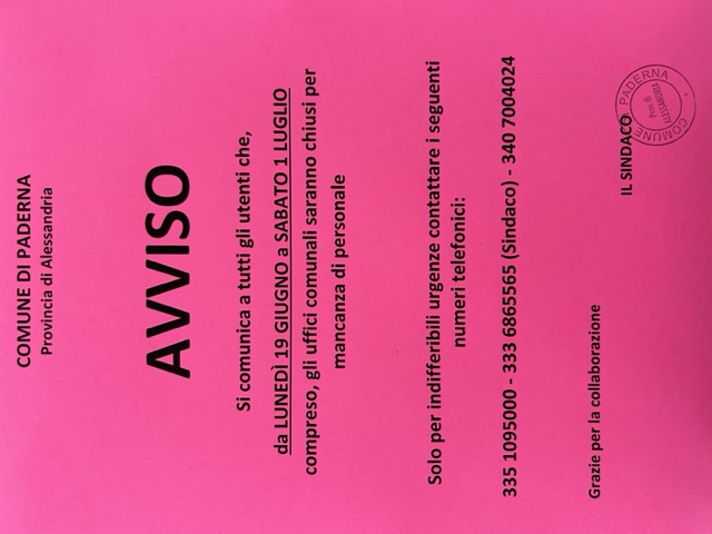 CHIUSURA UFFICI COMUNALI da LUNEDÌ 19 GIUGNO a SABATO 1 LUGLIO compreso